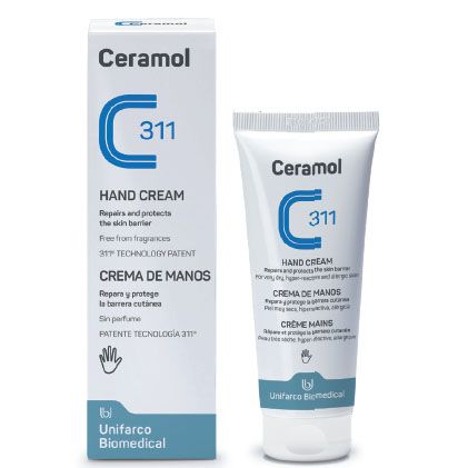 La Ceramol 311 Crema Manos repara y protege la barrera cutánea de las manos. Es ideal para pieles con sequedad crónica, tendencia atópica y en casos de alteración de la barrera cutánea causada por agentes externos de tipo químico, físico, profesional o climático. No contiene perfume ni conservantes con riesgo de alergia.
